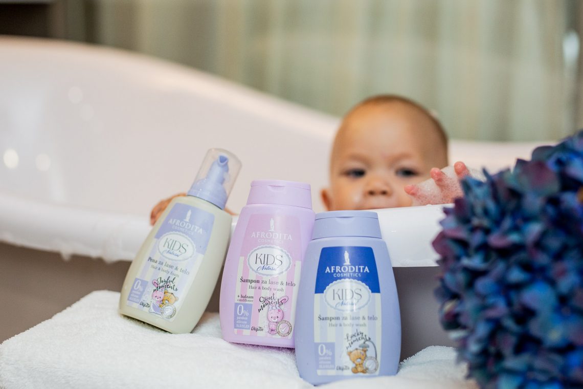 Čisto vsak večer, brez izjeme, se začne s kopanjem ali vsaj malo daljšim tuširanjem, ker vodo rees obožuje in jo še dodatno utrudi. Pred časom sem vam že opisala, zakaj sem se odločila za Afroditino linijo Baby&Kids, ki je glavni del naše nege, z njeno pomočjo pa Julija vsak večer čofota brez skrbi, da bi ji agresivne sestavine izsušile kožo.