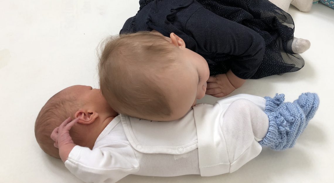 Ko sva naslednji dan le dobila zeleno luč, da lahko zapustiva porodnišnico, me je doma pričakala krasno opremljena hiška (hvala Jaka, Jerca in Grega – krasni ste! ❤️), v njej pa Julija z babico. Takoj, ko sva Tristanovo lupinico odložila na kavč sva videla, da to ni preveč dobra ideja, saj mu je skoraj iztaknila oko, ko ga je očitno poskušala pripraviti do tega, da bi pogledal, čez nekaj sekund pa ga je za las zgrešila leteča Legokocka, zato sva šla hitro v akcijo za zibko, kjer bi mali lahko čez dan brez nevarnosti dremal v dnevni sobi. Na srečo so bile punce pri Malih Zakladih tako zlate, da v rekordnem času izbrskale še zadnjo Stokkejevo zibko, v kateri je čez nekaj ur lahko že zadovoljno počival ?? Istočasno, ko sva domov prinesla Tristana, sva Juliji podarila lutko dojenčka, ki ima v kompletu še pleničke, dudo in stekleničko, da je lahko vse počela skupaj z mano – ko sem jaz hranila svojega dojenčka, je ona pitala “Bebija”, hkrati z mano ga je nosila naokrog, mu popravljala dudico… tako se je počutila pomembno, kot da ima tudi ona svojo vlogo pri vsem tem in ni odrinjena na stranski tir.