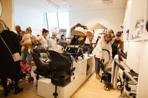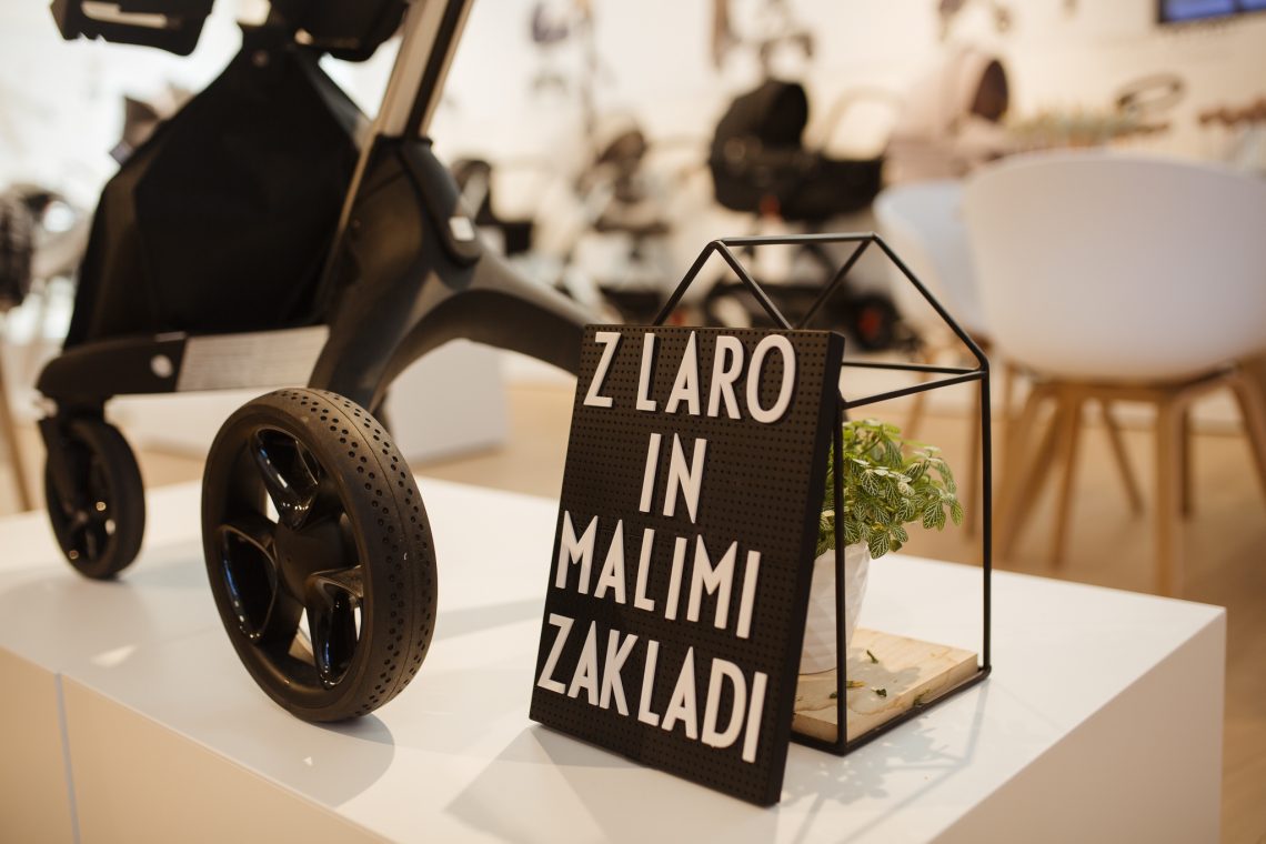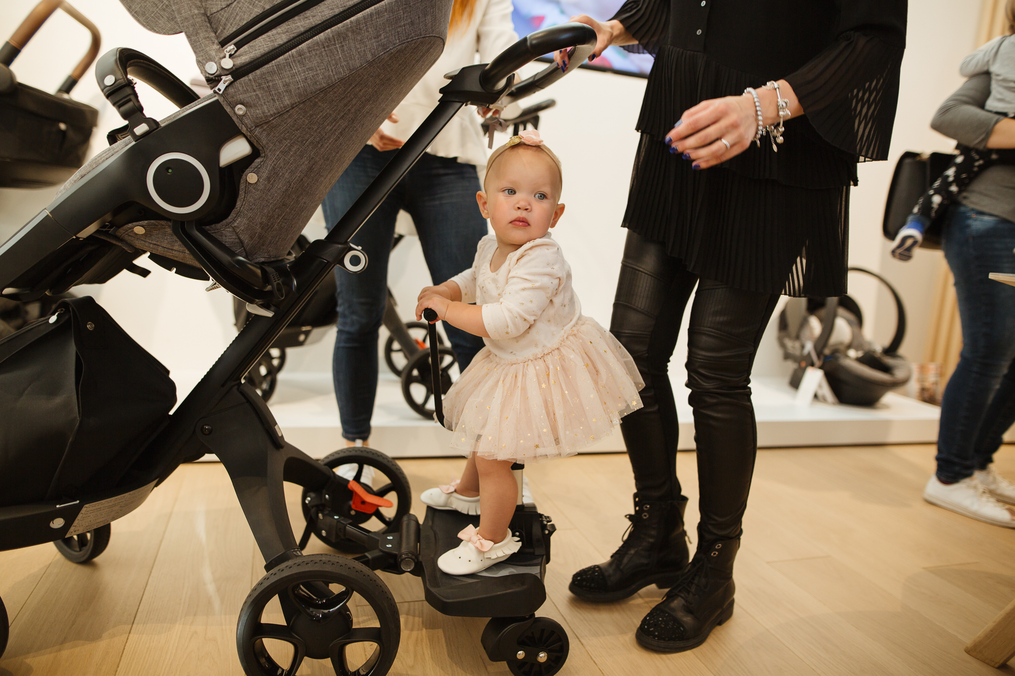 Prijazna Tina nas je popeljala med različnimi izbirami za mamice z majhno starostno razliko, kar avtomatično pomeni, da odpade kar nekaj vozičkov, ki te opcije ne ponujajo. Bugaboo Donkey me ni prepričal zaradi okornosti, saj si sebe z njim nikakor ne predstavljam manevrirati mimo nakupovalnih polic ali po ozkih pločnikih in tako smo izbiro takoj zožile na Uppababy Visto, Nuno Demi Grow in Stokke Xplory V6. Prva dva sta si dejansko dosti podobna, oba ponujata možnost kombiniranja košare za novorojenčka in športnega sedeža, sta lahka in okretna. Mene osebno je bolj prepričala Nuna že zaradi samega dizajna in lahkotnosti, s katero sem jo premikala po prostoru, opcije DreamDrape za optimalno zaščito pred soncem in resnično preprostega zlaganja, vendar se vseeno kar nisem videla s takšnim stilom vozička. Prvenstveno niti ne vem, kako navdušena bo Julija decembra nad vozičkanjem (že zdaj ne zaspi v njem niti v teoriji), sploh, ko enkrat ko konkretno shodi, pa tudi zavzamejo bistveno več prostora kot klasični, zato sem navdušeno pozdravila tretjo možnost – Stokke Xplory V6 z opcijo rolke. Pa ne tiste klasične, kjer mora otrok ves čas stati, tista mi nikakor ni potegnila, ampak super rešitev s sedežkom, ki se ga namesti pod ročaj in imaš tako starejšega ves čas pod kontrolo! ?? Priznam, očitno sem malo plehka, tako da mene malo Stokke kupi že z izgledom, potem pa seveda tudi samo funkcionalnostjo, saj resnično na njem ne najdem niti ene pomankljivosti, obkljukala sem oblazinjeno in zračno košaro, podaljšano strehico, super gume, veliko shranjevalno košaro… ta ideja s sedežkom pa je bila totalna zmaga. Ko sem pogledala naokoli, sem po navdušenju navzočih takoj vedela, da je to to, to bo naš voziček! ?