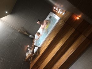 Soba, ki so nam jo v ta namen dodelili je sestavljena iz dveh masažnih miz in bazena z mehurčki – Julija je dobila 20 minutno masažo s čokolado, pa je še ni čisto prepričala, saj je ves čas migala in se hihitala, zato je po hitrem postopku odšibala k Jaku v Jacuzzi, Tristan je dremal v vozičku, jaz pa sem dobila svojih 60 minut sprostitve ?